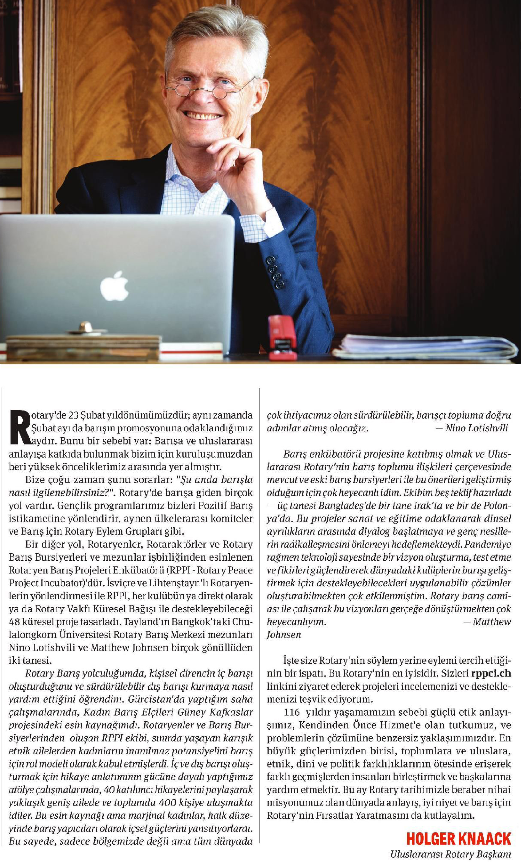 Rotary'de 23 Şubat yıldönümümüzdür; Aynı zamanda Şubat ayı da barışın promosyonuna odaklandığımız aydır. Bunun bir sebebi var: Barışa ve uluslararası anlayışa katkıda bulunmak bizim için kuruluşumuzdan beri yüksek önceliklerimiz arasında yer almıştır.